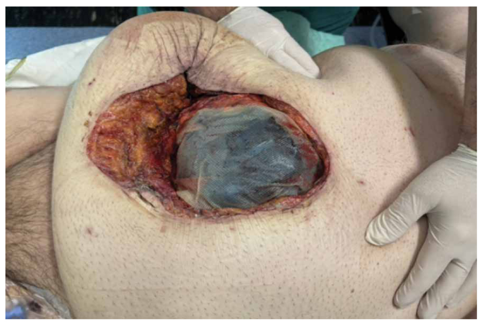 The patient underwent emergency exploratory laparotomy, which revealed a massive abdominal wall hernia defect measuring 110 mm. The significant size of the hernia and the presence of bowel strangulation necessitated urgent surgical intervention to prevent irreversible ischemic damage and to restore intestinal continuity. An open right hemicolectomy with side-to-side anastomosis was performed, and a a biologically derived, fully resorbable knitted monofilament mesh scaffold using Poly-4-hydroxybutyrate (P4HB) was placed intraperitoneally, with primary closure of the abdominal wall. Given the significant hernia defect and concern for high-tension primary closure in a super-super obese patient, an intraperitoneal mesh was initially placed to reinforce the abdominal wall and mitigate the risk of early postoperative dehiscence. In the context of emergency surgery, the intraperitoneal position allowed rapid reinforcement without the need for extensive dissection of retromuscular or preperitoneal planes, which would have prolonged operative time and increased the risk of bleeding in this critically ill, high-BMI patient. In emergency settings, especially when time is critical and contamination is borderline or uncertain, intraperitoneal mesh is often preferred for its ability to provide swift and effective reinforcement at the peritoneal level when posterior or preperitoneal planes are not safely accessible. Sublay positioning would have required time-intensive retromuscular dissection, with increased bleeding risk in an obese patient. Similarly, an onlay mesh was avoided due to the heightened risk of seroma formation and superficial infection in high-BMI individuals. The patient was admitted to the ICU postoperatively.