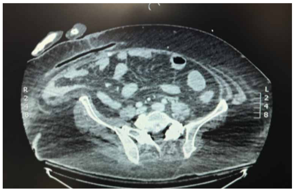 Figure 4. Postoperative CT scan performed approximately five days after definitive fascial closure and Phasix™ onlay mesh placement, in the context of fever investigation. The image demonstrates successful midline fascial approximation with convergence of the linea alba, supporting the effectiveness of the chosen closure strategy.