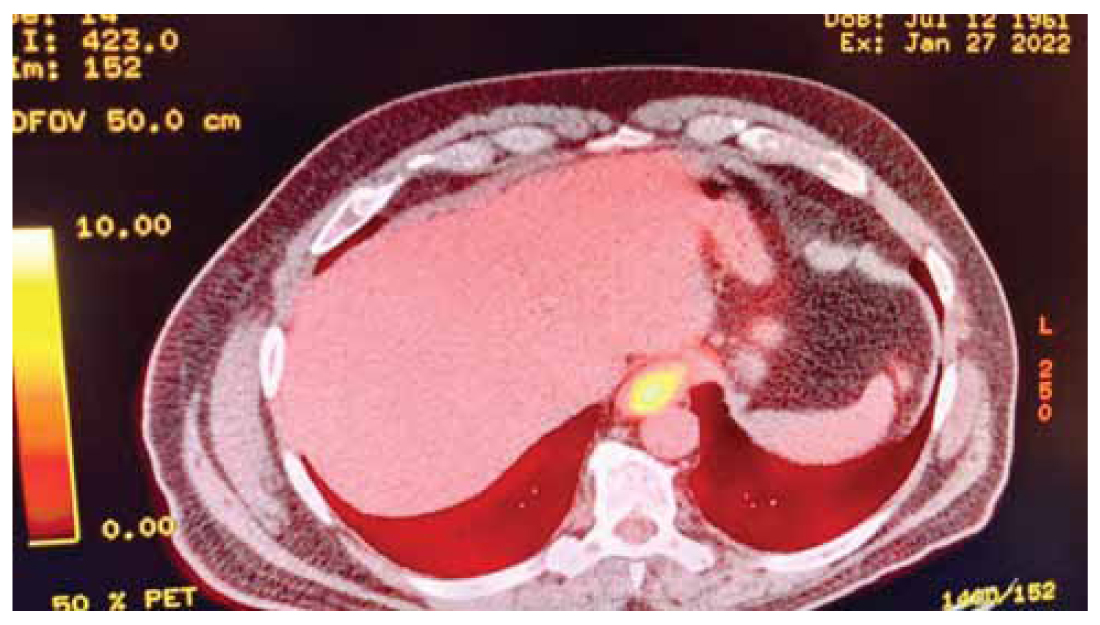 A 61-year-old male patient presented to the hospital reporting three-month worsening dysphagiato solid food, and unintentional weight loss of 6 kilograms within two months. Biochemical examination showed mild anaemia- haematocrit (37%), hemoglobin (11,8 g/dl), MCV (70,9 fL), MCH (22,6 pg/cell) and elevated CRP (96,3 mg/L). Tumour markers CEA and CA19-9 were found to be mildly elevated (22,3 ng/ml and 59,1 IU/ml respectively). The patient’s personal history included arterial hypertension and an angioplasty that had taken place 15 years prior. Firstly, a CT scan reported a mass at the level of the gastroesophageal junction. A PET/CT scan was then performed which revealed a lesion on the cardioesophageal junction with high 18F-FDG uptake (cT3N0M0) (Figure 1).