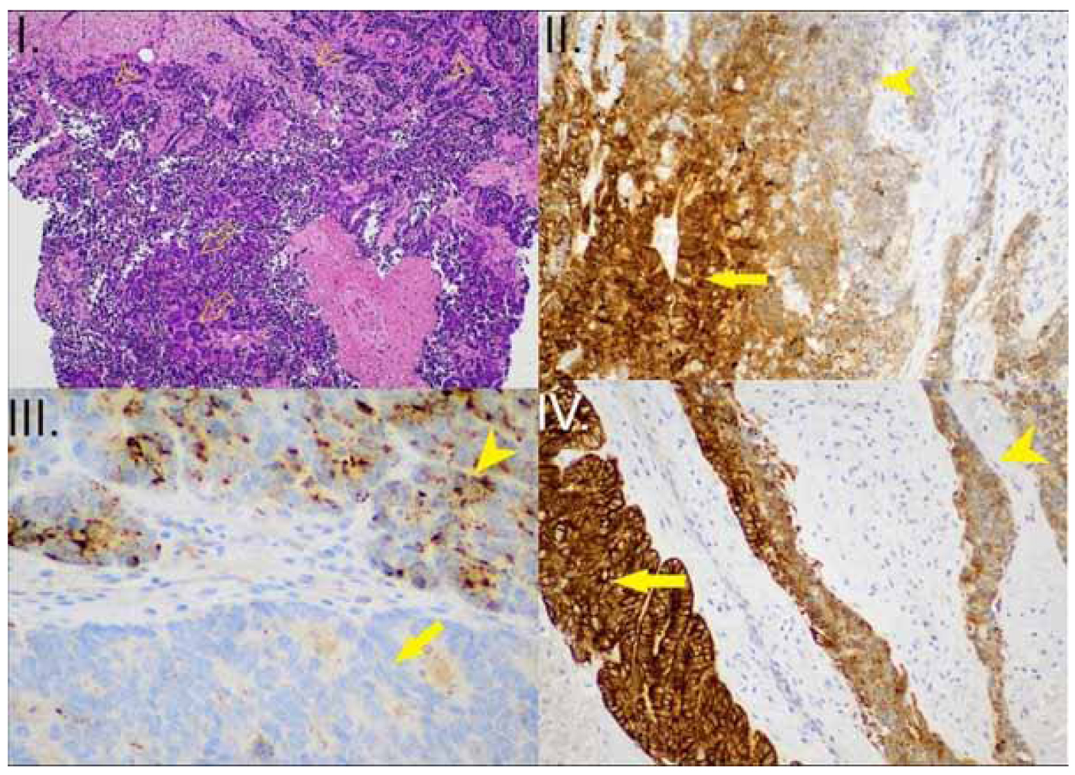 Figure 2. I. Mixed Neuroendocrine-Non-Neuroendocrine Neoplasm (MiNEN) (HE x100): The epithelial component is a high-grade adenocarcinoma (arrows). The neuroendocrine component is a Large Cell Neuroendocrine Carcinoma (LCNEC) (arrowheads) II. MiNEN (CK7 x200): positive in the adenocarcinoma component (arrow) and negative in the LCNEC (arrowhead) III. MiNEN (Chromogranin x200): negative in the adenocarcinoma component (lower part of the image – arrow), positive in the LCNEC (Antibody binds acidic glycoproteins in the soluble fraction of neurosecretory granules – arrowhead) IV. MiNEN (CK8/ 18 x200): intense, diffuse pattern of expression in the adenocarcinoma component (arrow), granular pattern of expression in the LCNEC (arrowhead).