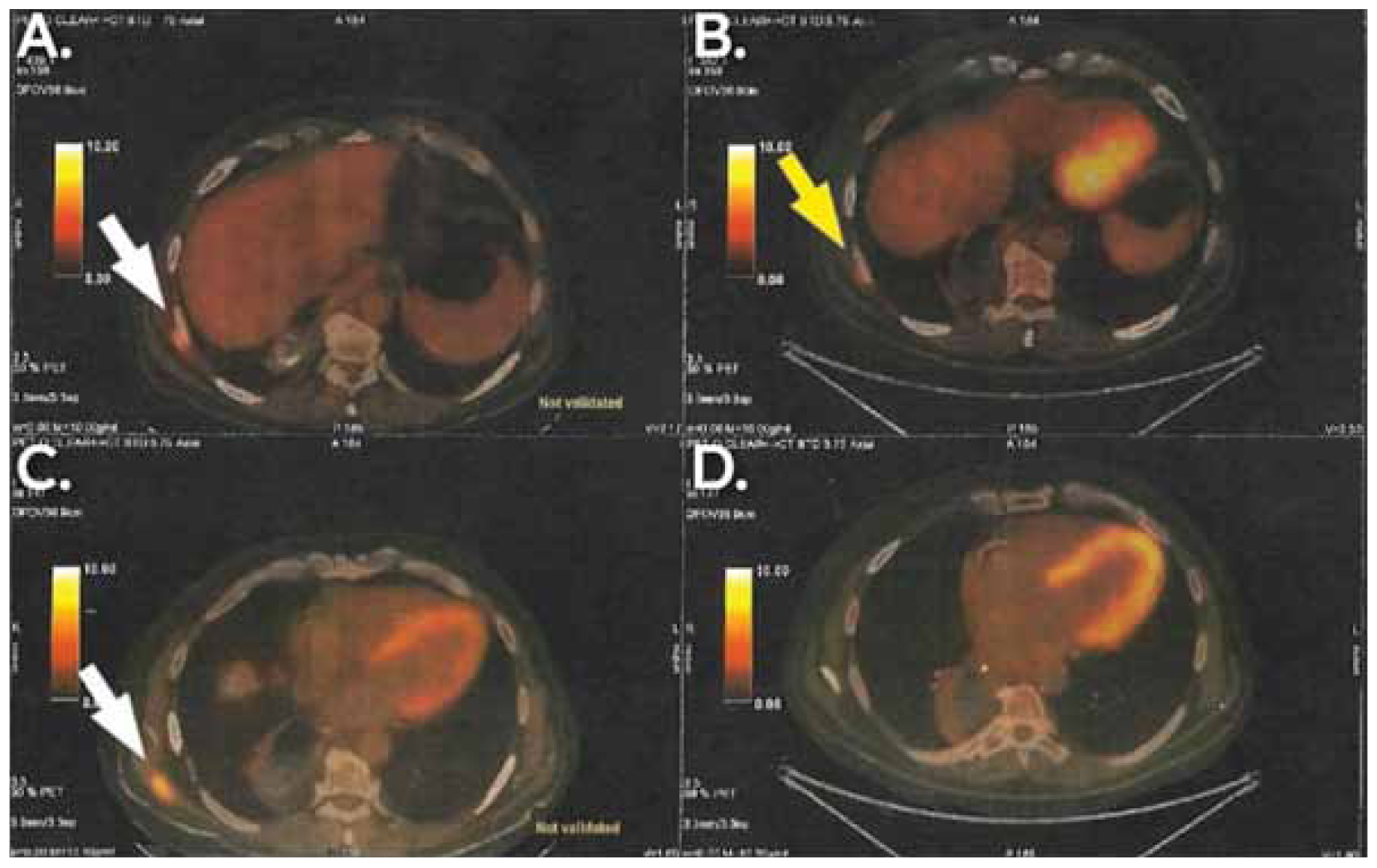 Figure 4. PET/CT showing the findings after the first and the second schemes of adjuvant therapy and their relapses respectively(B and D show the first relapse and A and C show the second relapse). Subcutaneous mass in the lateral and posterior thoracic wall (big yellow arrow in B) was the finding of the first relapse. An even larger subcutaneous mass in the lateral and posterior thoracic wall (white arrow in A) and an independent mass in the posterior thoracic wall in contact with latissimus dorsi (white arrow in C, absent in D) were the findings of the second relapse.
