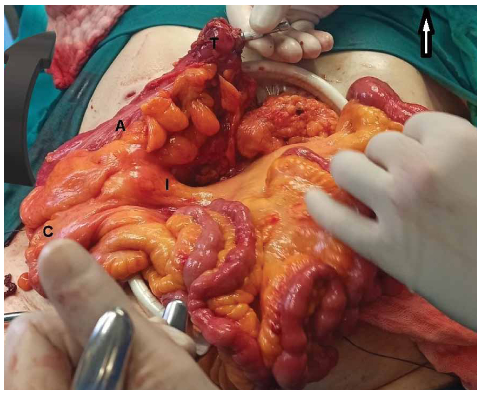 Figure 1. Intraoperative view of the proximal colon prior to inversion. Arrow at the upper left corner pointing towards the patient’s head. Curved black arrow showing the direction of caudo-cranial inversion A, anterior surface of the proximal colon; C, caecum; T, cut end of the transverse colon; I, ileocolic pedicle.