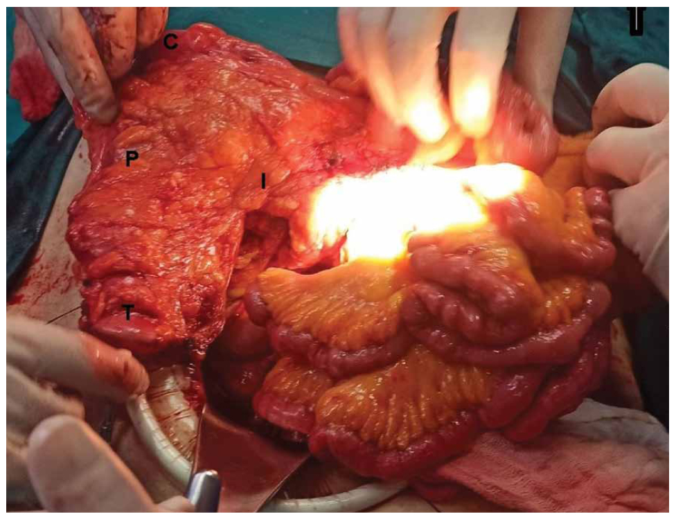 Figure 2. Intraoperative view of the proximal colon after inversion. Arrow at the upper left corner pointing towards the patient’s head; P, posterior surface of the proximal colon; C, ceacum; T, cut end of the transverse colon; I, ileocolic pedicle.