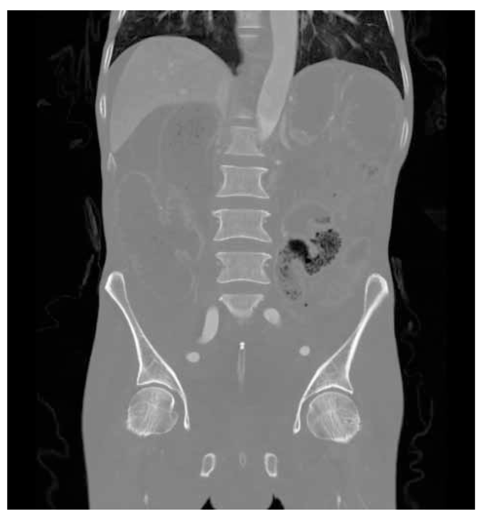 A 58-year-old male patient presented at the outpatient clinic with dyspeptic complaints. The patient had complaints of dyspepsia and upper gastrointestinal pain that had been ongoing for approximately five months. In the upper gastrointestinal system endoscopy, an ulcer with irregular borders, fragile to touch and malignant appearance was observed, which extended towards the greater curvature towards the proximal posterior wall of the corpus and the middle of the corpus. The histopathology report was evaluated as adenocarcinoma. Since no distant metastasis was observed on thoracoabdominal computed tomography (Figure 1), the decision to operate was made. Colonoscopy was not planned because the patient had no signs of constipation. Preoperative hemoglobin value was 12.9 g/dL and albumin value was 39.9 g/L. The patient received 4 cycles of chemotherapy with the FLOT regimen before surgery and 4 cycles after surgery. Subsequently, the patient underwent total gastrectomy, roux-n-y esophagojejunostomy and D2 lymph node dissection due to gastric cancer. The histopathology report was evaluated as gastric adenocarcinoma (T4aN3a) and intestinal type adenocarcinoma. There was no tumour in the surgical margins in histopathology. In histopathology report 36 lymph nodes were harvested and there was metastasis in nine lymph nodes. No postoperative complications developed and the patient was discharged on the 7th postoperative day. At three months after the surgery, the patient, who had no additional pathology, was admitted to the emergency room with ileus findings. On physical examination, there was widespread abdominal distension. Abdominal tomography showed widespread dilatation and air-fluid levels in the bowel loops. The patient underwent emergency surgery. During exploration, a mass lesion was observed in the proximal rectum, completely obstructing the lumen. There was no peritoneal carcinomatosis. Low anterior resection and loop ileostomy were performed. No postoperative complications were observed and the patient was discharged on the seventh postoperative day. The histopathology report of the case was evaluated as rectal metastasis of gastric cancer. The patient subsequently received adjuvant chemotherapy. The patient died four months after the second surgery due to poor general condition.