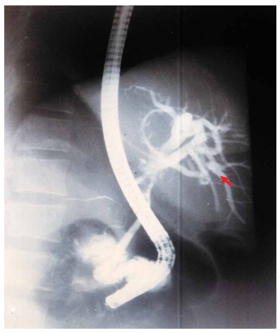 Figure 1. Endoscopic retrograde cholangiopancreatography (ERCP) showing stenosis of the bile duct convergence (arrow).