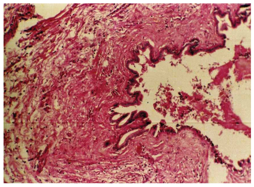 Various experimental studies have examined the effects of 95% alcohol, 10% povidone iodine, 0.9% – 5% – 10% – 20% NaCl, 3% H2O2, 5% formalin, 0.5% silver nitrate, and cetrimide on the liver and biliary tree. Serious hepatobiliary complications have been reported for formalin, alcohol, and 10%-20% NaCl [7,8]. K. W. Warren et al. [9] reported in 1966 in their study of 42 cases of sclerosing cholangitis the first case of CSC. The pathogenic effect of scolicidal products on the biliary mucosa is now well-known experimentally; indeed, in all reported cases, a CBF was present, allowing the passage of scolicidal solution into the bile duct tract, thus exposing the mucosa to chemical aggression. In all reported cases, the bile duct tract was normal at the time of primary surgery; sclerosing lesions developed rapidly afterward, affecting both the intrahepatic and extrahepatic bile ducts. In the present study, the 3 observed cases of CSC were presented with direct injection into the cyst after aspiration of 20 to 30 cc of hydatid fluid corresponding to the volume of scolicidal solution injected. Absence of bile duct lesions was observed, and cholangitis lesions developed rapidly without infectious episodes (Figure 2). In most reported cases, 2% formalin solution was the incriminated scolicidal solution in the development of sclerotic lesions. However, hypertonic solutions may also be responsible for CSC.